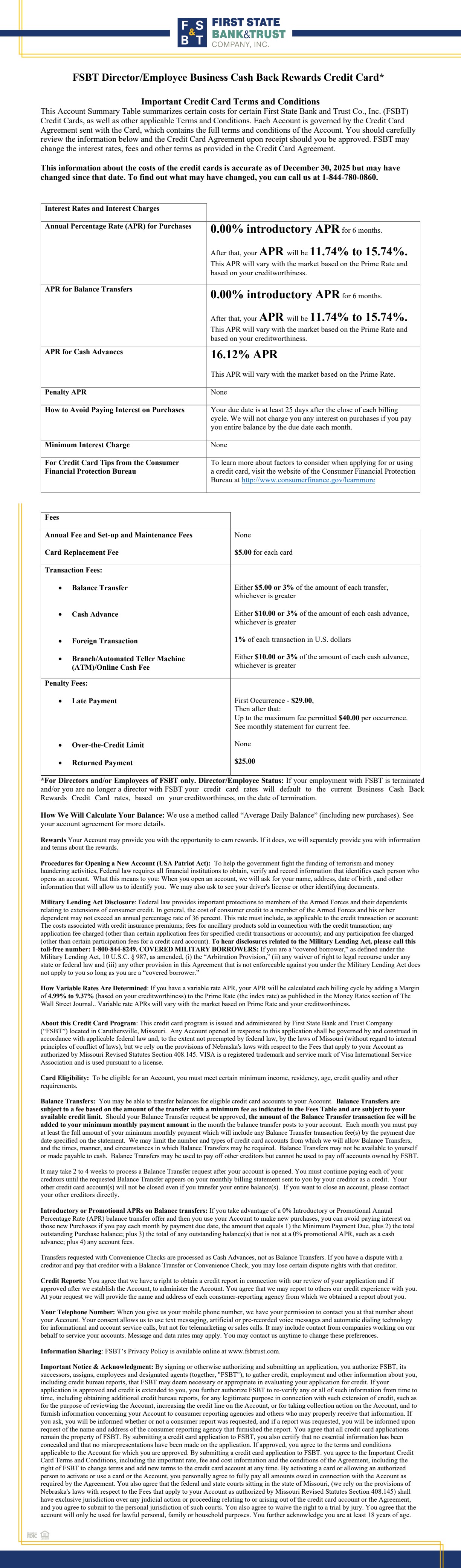 Employee Business Cash Back Rewards Credit Card Terms & Conditions